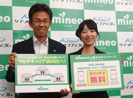 関西電力系のケイ・オプティコムは18日、スマートフォン向け格安SIMサービス「mineo(マイネオ)」で、9月1日に提供を始めるNTTドコモ回線の料金プランを発表した。データ通信量1ギガバイトで月額800円(音声通話対応の場合1500円)と、ほかのMVNO(仮想移動体通信事業者)とほぼ横並びの水準。