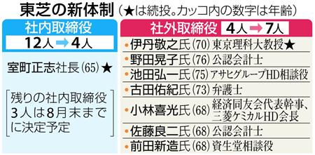東芝が利益水増し問題を受けて構築する新経営体制の柱は、社外取締役を活用し、経営を執行する社長らを監督する機能を強化することだ。不祥事発覚前の取締役で続投が決まっているのは室町正志社長と社外取締役の伊丹敬之東京理科大教授(経営刷新委員会委員長)の2人だけで、メンバーを大幅に入れ替え、経営刷新を図る。もっとも新体制は再生への最初の一歩にすぎず、問題発生の要因の一つとされた社内風土の改革などが課題になる。