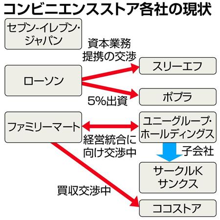 ローソンは昨年12月、中国地方を中心に展開する中堅コンビニ、ポプラに5%出資。ファミマも、ココストアの買収交渉に加え、サークルKサンクスを傘下に持つユニーグループ・ホールディングスと経営統合に向けた協議を続けている。