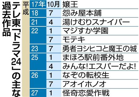 ドラマ24は平成17年10月にスタート。第1作はキャバクラ嬢の成長物語を描いた「嬢王」。以後の作品は、「エリートヤンキー三郎」などヤンキー系、「殺しの女王蜂」などお色気系、「マジすか学園」などアイドル系と、ジャンルは幅広い。岡部部長は「この枠はある意味、“何でもあり”。深夜だからこそ、思い切ったドラマを作りたいという狙いもあった。エッジを効かせつつ、DVDセールスやインターネット配信にもつながるような企画を常に考えている」と語る。