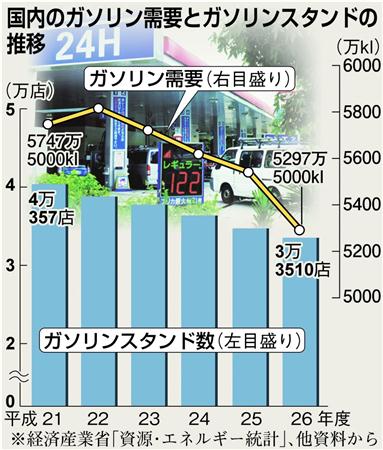 ガソリンスタンド(GS)の減少に歯止めがかからない。経済産業省によると、3月末のGS数は前年同月末比3.4%減の3万3510と、ピーク時の1994年度末に比べ約45%も減少した。少子化や低燃費車の普及でガソリン需要が減少し、採算が取れずに店をたたむケースが相次いでいるからだ。