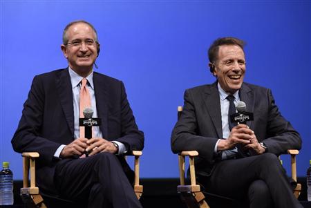 記者会見をするコムキャストのブライアン・ロバーツ会長(左)とユー・エス・ジェイのグレン・ガンペル代表取締役(右)=28日午後、大阪市此花区(甘利慈撮影)【拡大】