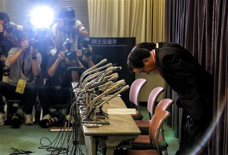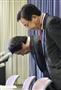 記者会見場で頭を下げる旭化成建材の堺正光常務(手前)ら=22日午後、東京都千代田区の国交省(早坂洋祐撮影)【拡大】