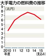 経産省によると、原発を持たない沖縄電力を除く大手電力9社の15年度の燃料費の合計は、6.1兆円程度となる見通し。東日本大震災前(08~10年度平均)並みに原発を利用した場合に比べ、15年度の燃料費は約2.3兆円増加し、国民1人当たり2万円弱の負担増になる。