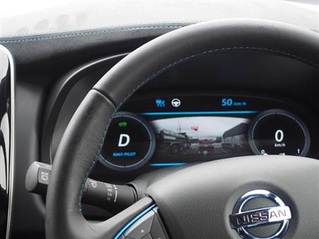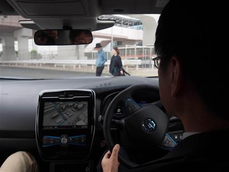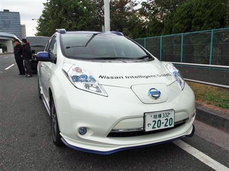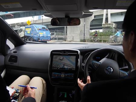 試乗会は、東京都江東区有明周辺の一般道約17キロで行われた。電気自動車「リーフ」を改造した実験車が走り出すと、運転手の操作で「ナビ自動運転に変わりました」と音声案内が流れた。