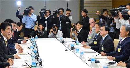 未来投資に向けた官民対話であいさつする安倍晋三首相(左)。右側手前から3人目がトヨタ自動車の豊田章男社長=5日午後、首相官邸(斎藤良雄撮影)【拡大】