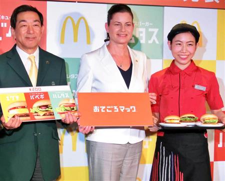 新メニュー「おてごろマック」を持つ店員らとサラ・カサノバ社長(中央)【拡大】