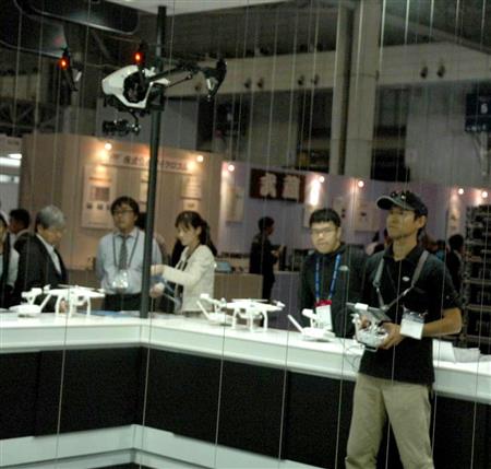 会場の屋外では、ドローン世界最大手の中国・深セン市大疆創新科技(DJI)が飛行と空撮のデモンストレーションを実施。スタッフがコントローラーで操作する主力製品「ファントム3」などが地上十数メートルの高さから撮影した鮮明で、ぶれのない映像が地上モニター画面に映し出され、来場者を驚かせた。