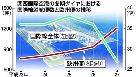 アジア路線の大幅増便で平成27年冬期ダイヤ(28年3月26日まで)の国際定期便が開港以来最多の就航便数となった関西国際空港。ただ、その裏で欧州路線の減便が進んでいることが課題として浮上してきた。長距離線の不振がボディーブローのように利いており、旅行会社からは「ツアーで制限が多く、行程が組めない」と悲鳴が上がる。格安航空会社(LCC)の誘致に成功して復活を印象づけているが、アジア向けローカル空港としての位置づけが定着することに懸念が広がっている。(藤原直樹)