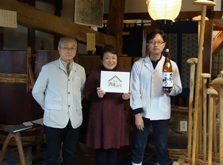 東北酒蔵街道の取材で訪れた蔵、渡會本店の渡會俊正社長(左)と筆者(中)=25日、山形県鶴岡市【拡大】