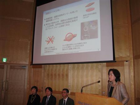 食道再生上皮細胞シートの開発状況について説明するセルシードの橋本せつ子社長=4日、東京都港区のスウェーデン大使館【拡大】
