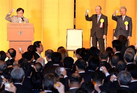 パーティーには大手企業のトップら約1800人が参加した。例年、首相が出席し経済運営に協力を求めるが、安倍首相は今年、伊勢神宮参拝のために欠席した。
