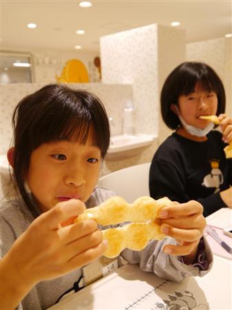 新商品はハチミツ、チョコ、きなこ味の3種類で、生地がよく伸びるのが特徴。もちもちの食感は定番のポン・デ・リングと同様だが、引っ張るとよく伸びる。「食べる時の楽しさを演出した」(広報担当者)という。この日はミスドの会員39人が新商品を体験。香川県高松市から家族4人で来た小澤佳奈恵さん(10)は、生地の伸びを試しながら「おいしい」と楽しんだ。