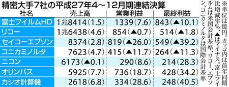 精密機器大手7社の2015年4~12月期連結決算が5日、出そろった。デジタルカメラの高級機や、医療機器、製造装置などが好調だったオリンパスなど4社が営業利益で増益を確保。腕時計や自撮りに適したデジカメが販売を伸ばしたカシオ計算機は4~12月期として、2年連続で最終利益が過去最高を更新した。