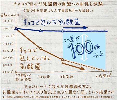 人間の胃酸は、殺菌力のある強力な塩酸で構成されている。乳酸菌は一般的に胃酸に弱く、腸に届くまでに死滅してしまう。だが、胃酸は油をほとんど分解することはできず、腸がこれを行う。チョコレートの油脂に包まれると乳酸菌が守られ、生きたまま腸に届くのである。