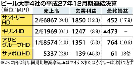 ビール大手4社の2015年12月期連結決算が15日、出そろった。最終利益はビールや缶チューハイ、ウイスキーなどが好調だったことで、サントリーホールディングス(HD)やアサヒグループHD、サッポロHDの3社が増益を確保した。