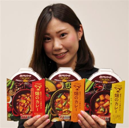 新商品は「たっぷり野菜と鶏肉のカレー」、「ひきわり豆のトマトカレー」、「かぼちゃのアーモンドカレー」の3種類。保温性の高いオリジナルの容器にお湯を注ぐだけで、60秒で出来上る。店頭販売と通信販売を合わせて12月末までに74万食の販売を目指す。