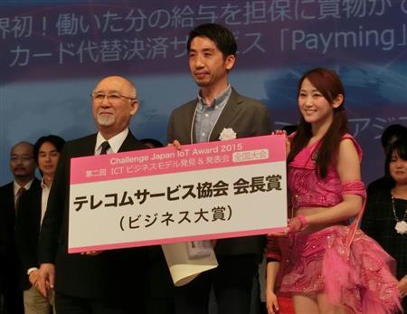 IT活用で地域を変えるビジネスプランを競い合う「ICTビジネスモデル発見&発表会 全国大会」(主催・ICTビジネス研究会、テレコムサービス協会)が17日、開かれた。ビジネス大賞にはドレミングアジア(福岡市東区)の「世界初!働いた分の給与を担保に買い物ができるカード代替決済サービス『Payming』」が選ばれ、桑原広充社長に賞状と賞金が手渡された。