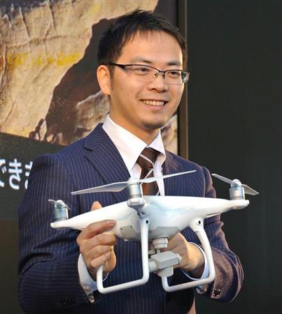 障害物を回避できる新型のドローン「ファントム4」を発表したDJI日本法人の呉韜社長=3日、東京都港区(後藤徹二撮影)【拡大】