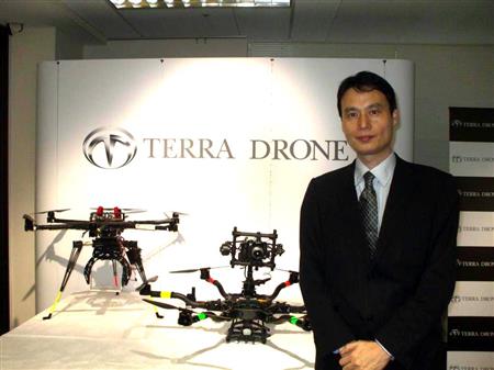 テラドローンがサービスを提供するドローンと徳重徹社長=16日【拡大】