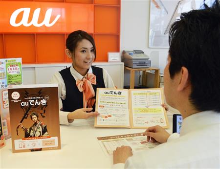 電気と携帯電話料金のセット割引プラン「auでんき」を説明するスタッフ=31日、新潟市中央区のauショップ県庁前(臼井慎太郎撮影)【拡大】