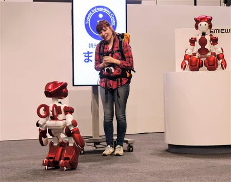 日立製作所は8日、接客や案内を行うヒト型ロボット「エミュー3」を開発したと発表した。インターネット経由で、音声や画像、言語処理を遠隔で行うITシステムとセットで提供する。多言語に対応し、商業施設や空港などで訪日客の接客やガイドでの活用を想定している。今年度から実証実験を開始し、2018年度の実用化を目指す。