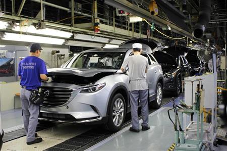 マツダは広島市の本社工場で北米向けの新型スポーツ用多目的車(SUV)「CX-9」の生産を開始し、14日、生産ラインを報道陣に公開した。今後、円高が加速すれば、日本からの輸出には“逆風”となる。マツダは開発部門と生産部門が一体となった構造改革を進めることで、円高でも利益が出る体質づくりに取り組んでいる。