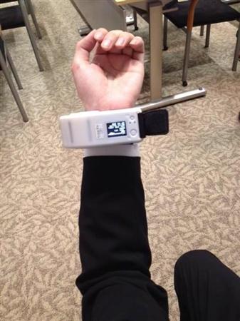 現在、開発した機器の大きさは、幅が35ミリ、長さが100ミリ、高さが40ミリ、重さが200グラム。測定可能時間は10時間。今後、オムロンは機器を小型化し、測定時間も延ばしていく。