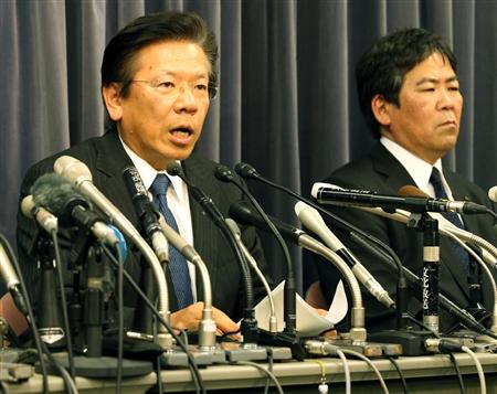 三菱自動車の燃費データ不正問題で、国交省への報告を終え記者会見をひらく相川哲郎社長(左)=26日、国交省(早坂洋祐撮影)【拡大】