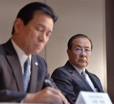 2015年度業績予想の修正記者会見で説明を行う室町正志代表執行役社長。左は志賀重範代表執行役副社長=26日午後、東京都港区の東芝本社ビル(納冨康撮影)【拡大】