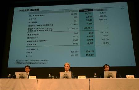 2016年3月期決算の概要を説明するソニーの吉田憲一郎副社長(中央)=28日、東京都港区【拡大】