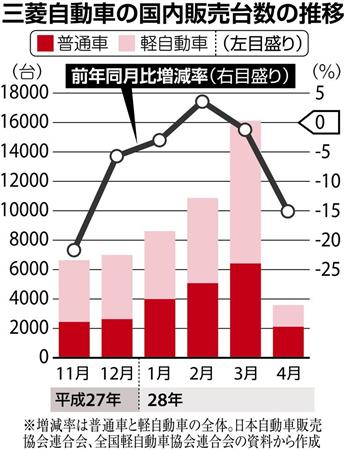 三菱自動車の4月の軽自動車販売は、燃費データ不正問題で主力軽「eK」シリーズを販売停止したことで、前年同月比44・9%減の1477台に落ち込んだ。軽の供給先の日産自動車も51・2%減の5574台となり、いずれもほぼ半減した。販売停止の長期化やイメージ悪化で厳しい状況は続く見込みで、下請け企業などへの補償も含めて損失が拡大する恐れがある。