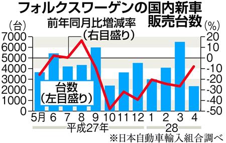 VWの国内新車販売台数は、排ガス不正直後の昨年10月に前年同月比48.0%減とほぼ半減した。その後も低迷が続き、2015年度の外国メーカー車の国内販売で、16年ぶりに独メルセデス・ベンツに首位を奪われた。