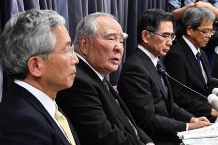三菱自動車に続き、誤った自動車の燃費データ計測をしたスズキの会見で、説明する鈴木修会長(手前から2人目)=18日午後、東京都千代田区の国交省(宮崎瑞穂撮影)【拡大】