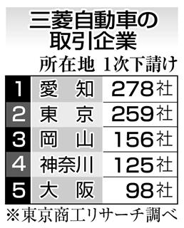 東京商工リサーチの調べでは、三菱自グループと直接取引する1次下請けは、名古屋製作所がある愛知県が278社で最も多く、岡山県も156社を数える。倉敷市は主力工場・水島製作所のおひざ元で“三菱自の企業城下町”といえる。