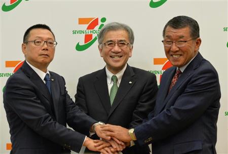 新体制発足記者会見で握手する、左からセブン&アイ・ホールディングスの後藤克弘副社長、井阪隆一社長、古屋一樹セブン-イレブン・ジャパン社長=26日、東京都千代田区【拡大】