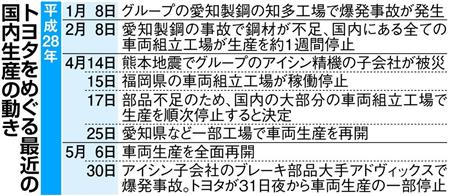 トヨタは31日夜に高岡工場(愛知県豊田市)など4工場6ラインでの生産を止め、1日朝からは元町工場(同)など9工場14ラインでの車両生産を取りやめる。トヨタは生産への影響について「精査中」とするが、アドヴィックスの生産停止が長引けば、大幅な減産につながりかねない。