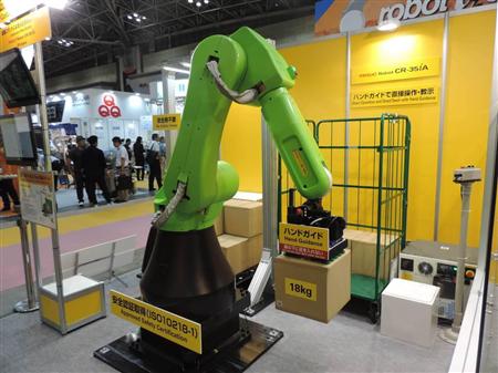 一方、ファナックは35キロの重量物を運搬する協働ロボット「CR-35iA」を展示した。人工知能(AI)で人の動きを検知し、接触するとすぐ停止する。自動車業界で受注が好調だという。