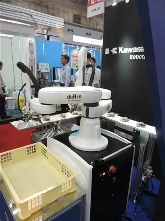 川崎重工業は安全柵を設けずに、作業者の隣に設置できる双腕ロボット「デュアロ」を展示した。具材の箱詰めなどの作業を行う。ロボットビジネスセンター国内営業2部の山岡保浩部長は「3交代制の工場などでの導入が増えてきた」と話す。人手の確保が難しい深夜帯の作業にデュアロを導入するなどの事例が多いという。