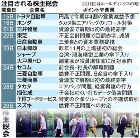 3月期決算の上場企業の株主総会が来週から本格化する。昨年6月に東京証券取引所の「コーポレートガバナンス・コード(企業統治原則)」の適用が開始されてから1年が過ぎ、社外取締役の選任が進むなど、形式面は整いつつある。一方、会計や製品性能をめぐる相次ぐ企業不祥事にみられるように、実態はまだ追い付かない状況だ。緒に就いた企業統治改革の流れを加速できるかが焦点となる。