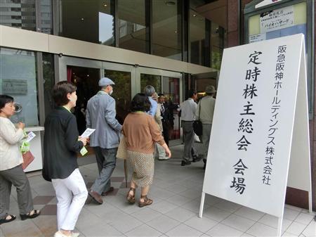 関西を代表する私鉄2社を保有する阪急阪神ホールディングス(HD)の定時株主総会が14日、大阪市内で開かれた。株主には熱心な鉄道利用者やファンも多く、運行ダイヤ見直しをはじめ、阪急の滋賀県延伸や、新チケット導入などを要望する突っ込んだ質問が相次いだ。また、傘下のプロ野球・阪神タイガースの運営をめぐり、球団愛に満ちた意見・提案も続出。会場には沿線住民と思われる中高年女性の姿が目立ち、ユニークな質問が飛ぶと厳粛な会場が笑いに包まれるなど、人気企業らしい総会となった。(大島直之)