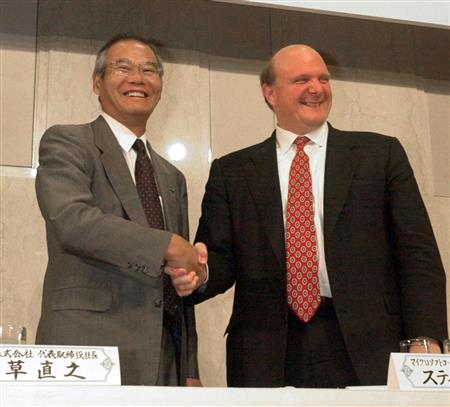 富士通と米マイクロソフトの業務提携を発表する秋草直之氏(左)=2000年9月【拡大】