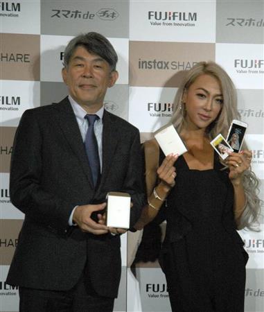 「スマホde チェキinstax SHARESP-2」をアピールする富士フイルムイメージング事業部の叩武冨博信次長とタレントのGENKINGさん=27日、東京都港区(宇野貴文撮影) 【拡大】