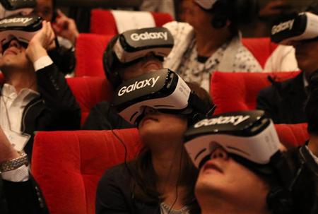 フジテレビとグリーがバーチャルリアリティ(VR)に関する業務提携について行った記者会見で、報道陣によるVR映像の体験が行われた=30日、東京・台場(荻窪佳撮影)【拡大】