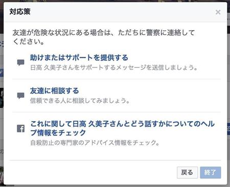 フェイスブックは、自殺防止ツールをアップデートし、日本語版も利用可能になったと発表した。フェイスブック上で自殺や自傷行為をほのめかしているユーザーを見つけた友達や家族が、それを防止するために利用できる機能を提供する。フェイスブックが対応している全言語での提供を進めているとしており、今回、日本では一般社団法人日本いのちの電話連盟と特定非営利活動法人国際ビフレンダーズ東京自殺防止センターの協力を得て提供が実現したという。