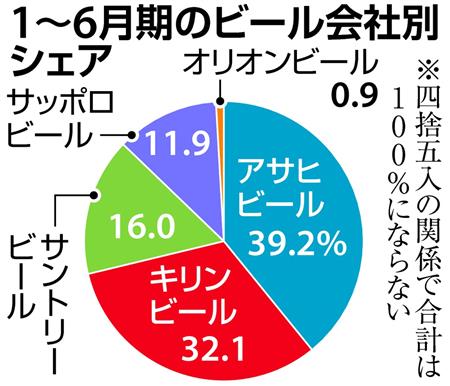 ビール類の1~6月期のシェアは、サントリービールが16.0%(同15.5%)、サッポロビールが11.9%(同11.5%)とそれぞれシェアを伸ばし、オリオンビールは0.9%と横ばいだった。順位に変動はないが、唯一シェアを落としたキリンの苦戦が鮮明となった。