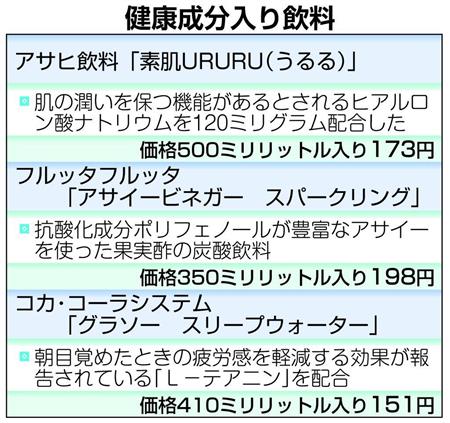 アサヒ飲料の機能性表示食品「素肌URURU(うるる)」は、肌の水分を保持して潤いを保つとされるヒアルロン酸ナトリウムを、1本(500ミリリットル)当たり120ミリグラム配合した清涼飲料水。気分を爽快にしてくれるユズの風味。カロリーは1本当たり97キロカロリーと少なめに抑えた。希望小売価格は173円。