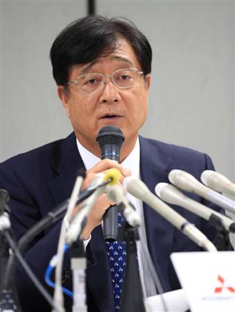 三菱自動車の燃費不正問題に関連して、会見する益子修会長兼社長=2日午後、東京都港区(桐原正道撮影)【拡大】