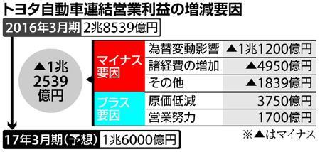 トヨタの場合、対ドルに対し1円円高が進展すると年400億円の営業減益要因となる。2016年4~6月期の営業利益をみると、為替影響が2350億円の減益要因となり、原価改善や営業努力による1750億円の増益要因が丸のみされた。さらに通期の試算では、円高だけで1兆1200億円の利益が吹き飛ぶ計算だ。