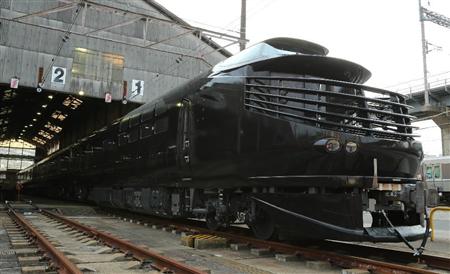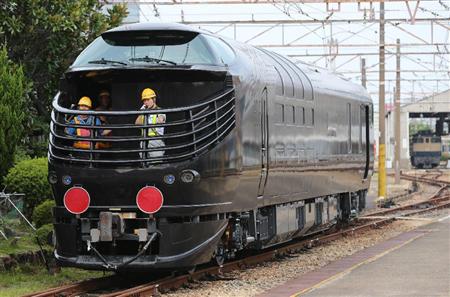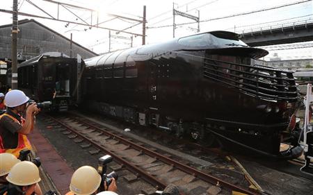 平成29年春に運行が始まるJR西日本の豪華寝台列車「トワイライトエクスプレス 瑞風」の先頭車両が完成し、大阪市淀川区の車両基地に15日、搬入された。